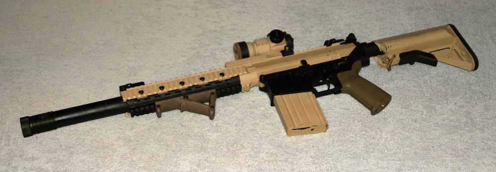 Pěknej tlumič...ten úchyt na šachtě je hroznej, lišta pod ACOGem taky. Máš to 4x32 ACOG nebo jen kolimátorovou náhražku? Jestli jako kolimec, tak to tam AN/PEQ nemůže vadit  tam jde o tu tečku a ne to co vidíš vpředu...já mám třeba aimpoint zakrytkovanej zpředu a to permanentně...mám tam je malou dírku abych případně pravým okem viděl tu správnou část těla. Ale dá se s tím běhat i s komplet zavřeným, protože se do toho čumí oběma očima.