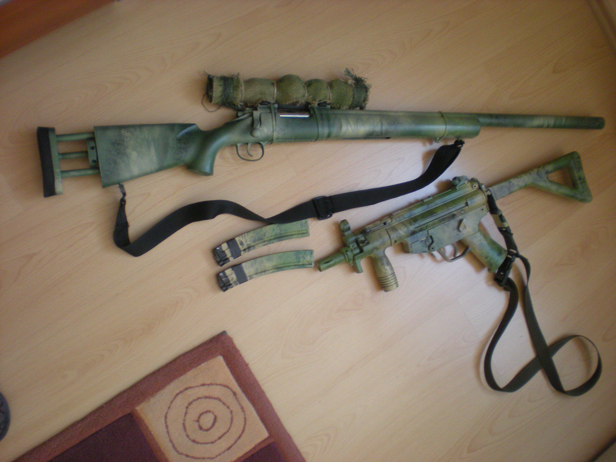 S tím že se maskujou jen doplňky a tělo zůstane netknutý se dá setkat i v AČR, protože na většině útvarů je stříkání zbraní zakázaný, tak si někteří vojáci nastříkaj jen doplňky který jsou jejich (zásobník, kryt závěru, předpažbí...). Ikdyž to má maskovací účinek dost omezenej, tak to ten typickej tvar zbraně docela slušně rozbije. Ale to jen tak naokraj. Jinak desert marpat na těch fotkách je fakt krásnej, je vidět že někdo si dal záležet... no a jak jsou na tom noži ty lebky, ty bych si uměl docela dobře představit na nějakým tlumiči u zkrácený M4