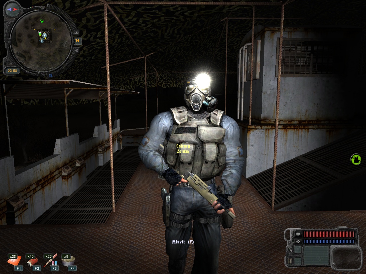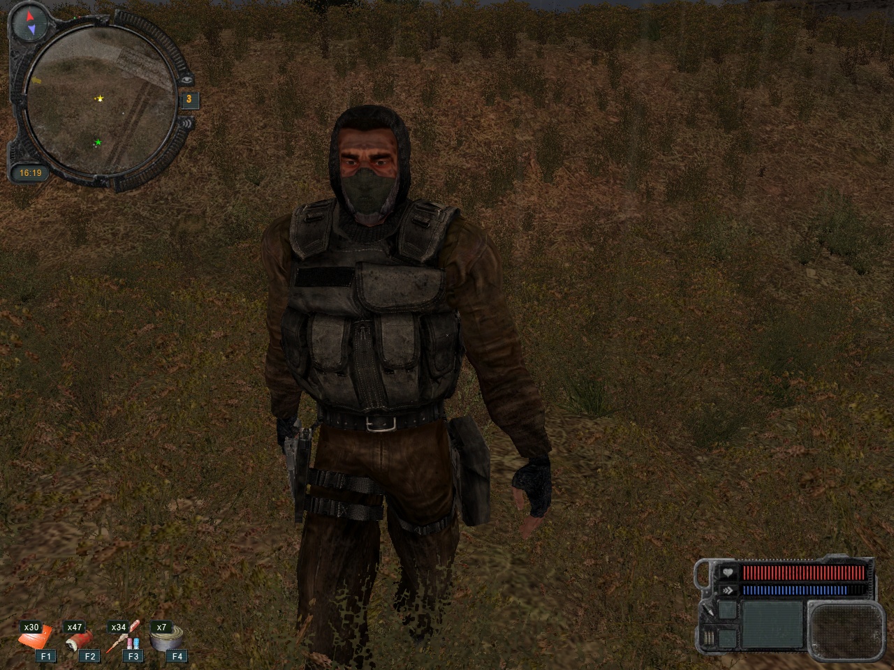 Ja používam kabát vz. 85 bez vložky (klasika), samozrejme s kapucou. Na rukáve nášivka  , k tomu pracovné 92-ky nohavice (vyrábalo sa niekoľko odtieňov, ja mám tmavšie), 60-ky kanady. Na trupe nosím chorvátsku vestu (už asi 7 rokov, stále mám tu istú a zatiaľ ma NIKDY nesklamala a drží, za tú cenu absolútne úžasná vec pre ľudí čo nepotrebujú molle ani milión sumiek), na S.T.A.L.K.E.R-a sa hodí priam úžasne, až som bol prekvapený... pôvodne som si chcel ušiť vlastný bandalír, čo by nebol problém, lenže tá vesta je podľa mňa skrátka perfektná aj na túto úlohu. K tomu mám na chrbte starý lovecko-turistický československý plátený ruksak cca zo 70. rokov, na ľavom popruhu mám dýchaciu trubicu - na jednom konci mi visí dýchacia polomaska, druhý koniec je stočený v batohu. Pri hre mám trubicu uchytenú na popruhu batoha, takže maska je kedykoľvek dostupná a vôbec neprekáža. A na rukách samozrejme rukavice. Celkovo ma tá výbava vyšla asi na 10 - 15 eur vrátane výroby nášivky s tým, že kabát, nohavice, kanady, vestu som mal doma. Mne to stačí a som spokojný