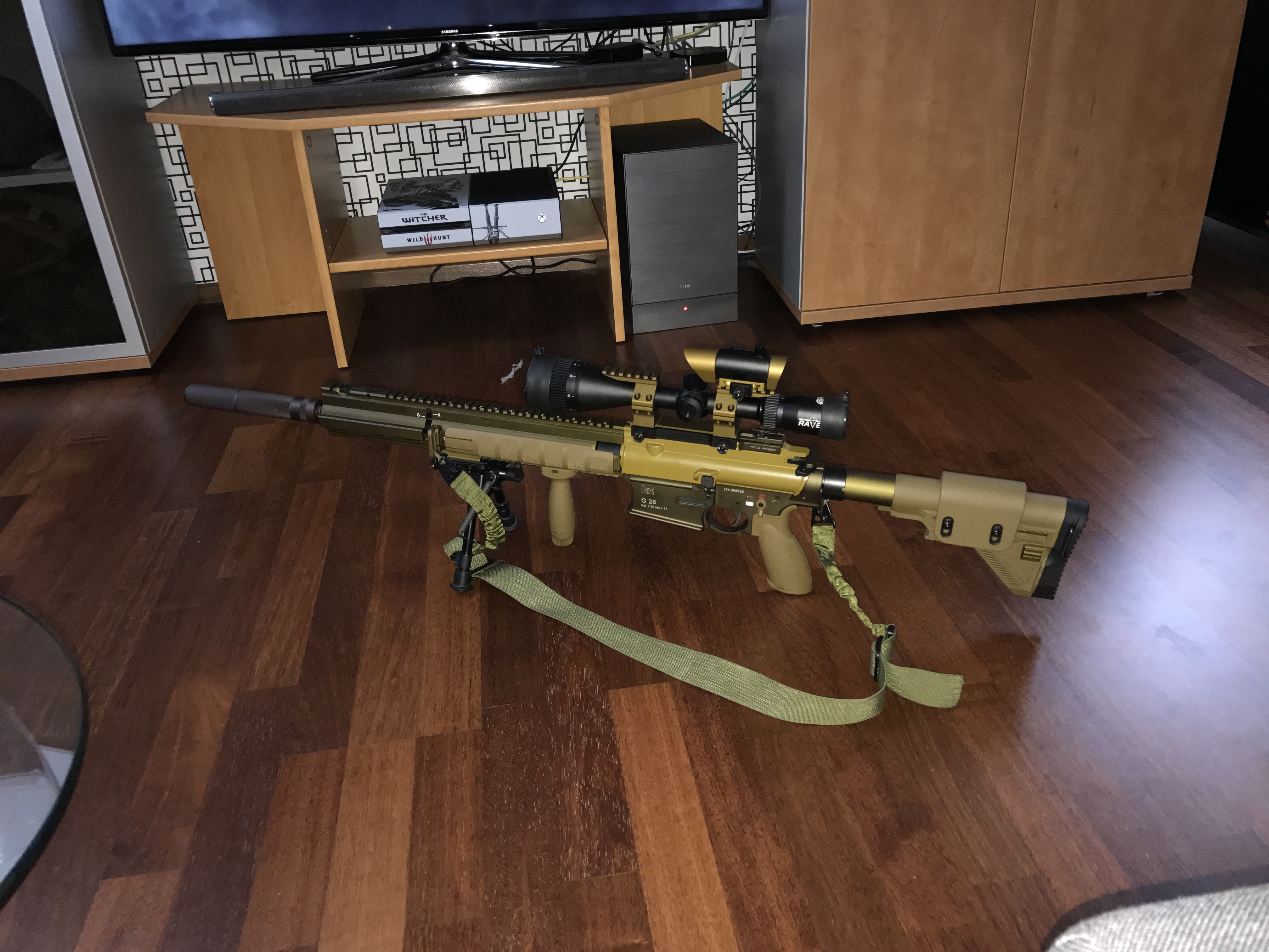 A pak samozřejmě zbraň. Jedná se o limitovanou edici (300 kusů na světě) plynové Heckler & Koch G28 od VFC, se třemi zásobníky. Uvnitř je hlaveň Maple Leaf spolu s gumičkou Maple leaf. Dále byla měněna tryska za trysku verze 2, která je výkonově nastavitelná. Aktuálně střílím 145 m/s s 0.4 kuličkama, tedy cca 4 joule. Zbraň teď jak je, tedy vše seřízeno a už si to na sebe zvyklo střílí absolutně přesně, trefoval jsem s tím postavy na více než 100m. K pušce je samozřejmě originální příslušenství (v tomto případě ho H&K dává přímo z ostré verze, a to dvojnožka, rukojeť a montážní základna optiky a kolimátoru). Optika je Raven 4-16x50 (vypadá nejvíce jako optika u ostré) a kolimátor aimpoint T1 ( výrobce nějaký německý, asi jediný sedí do montáže kromě originálu). Zbraň má vystříleno cca 600 kuliček.