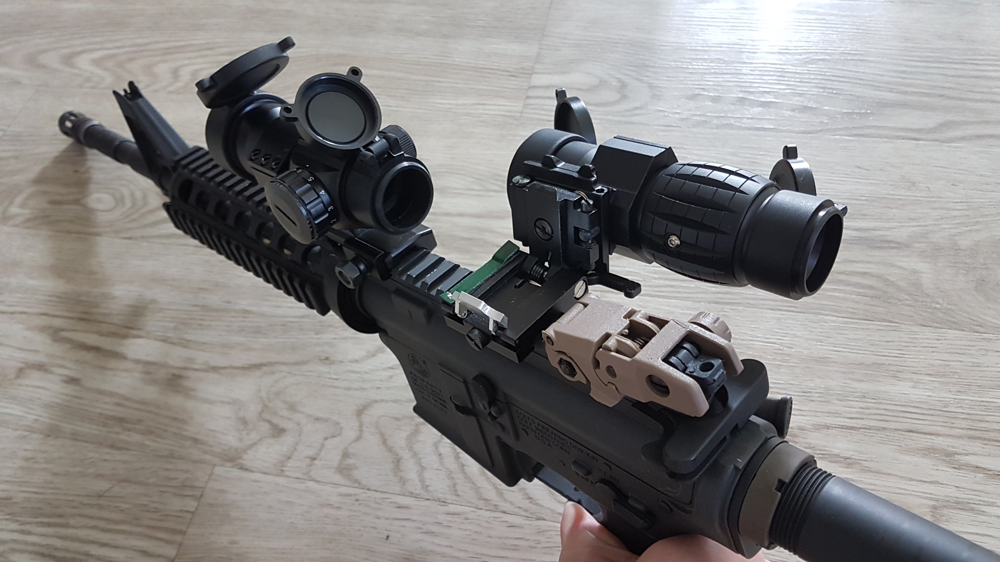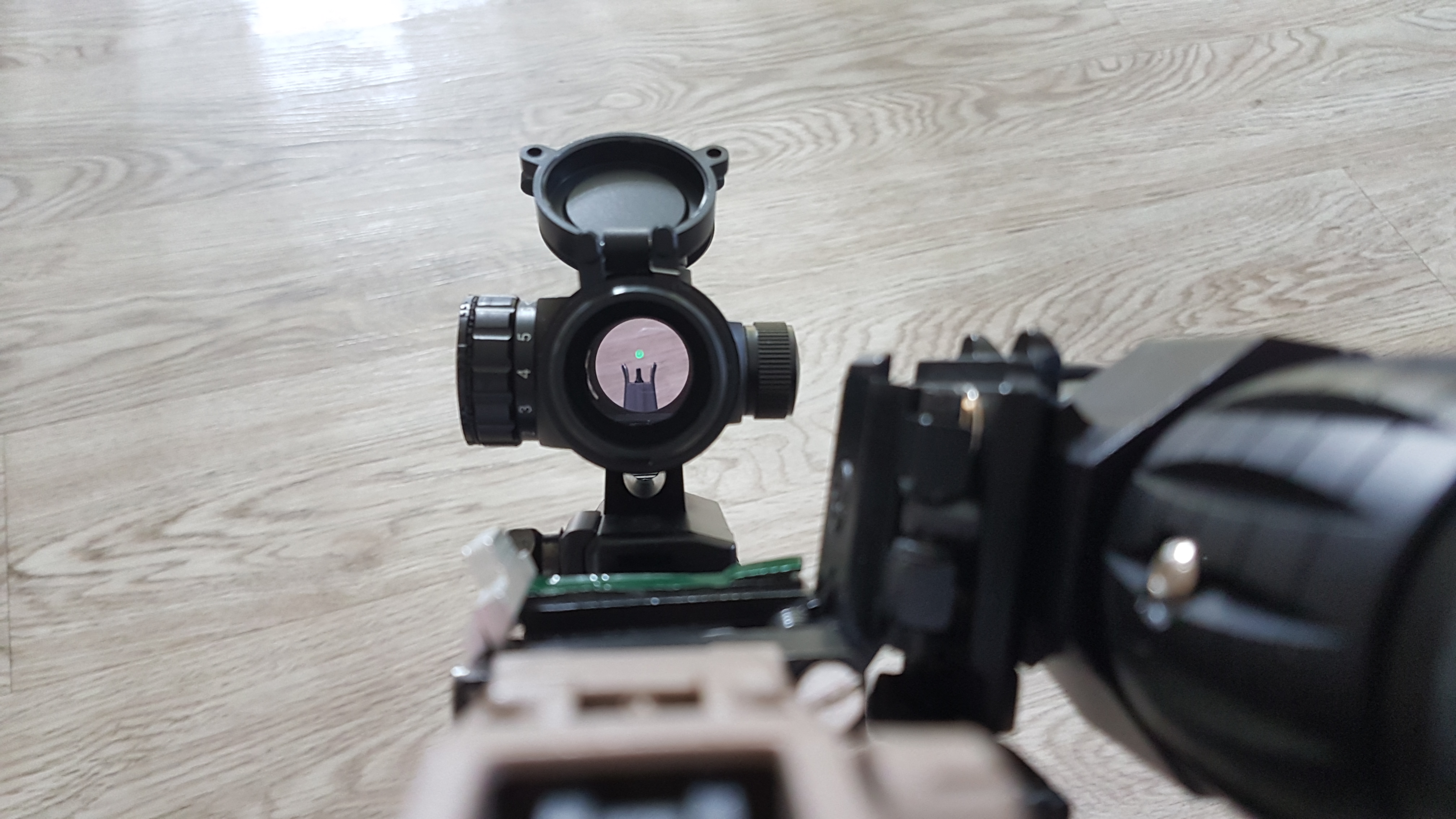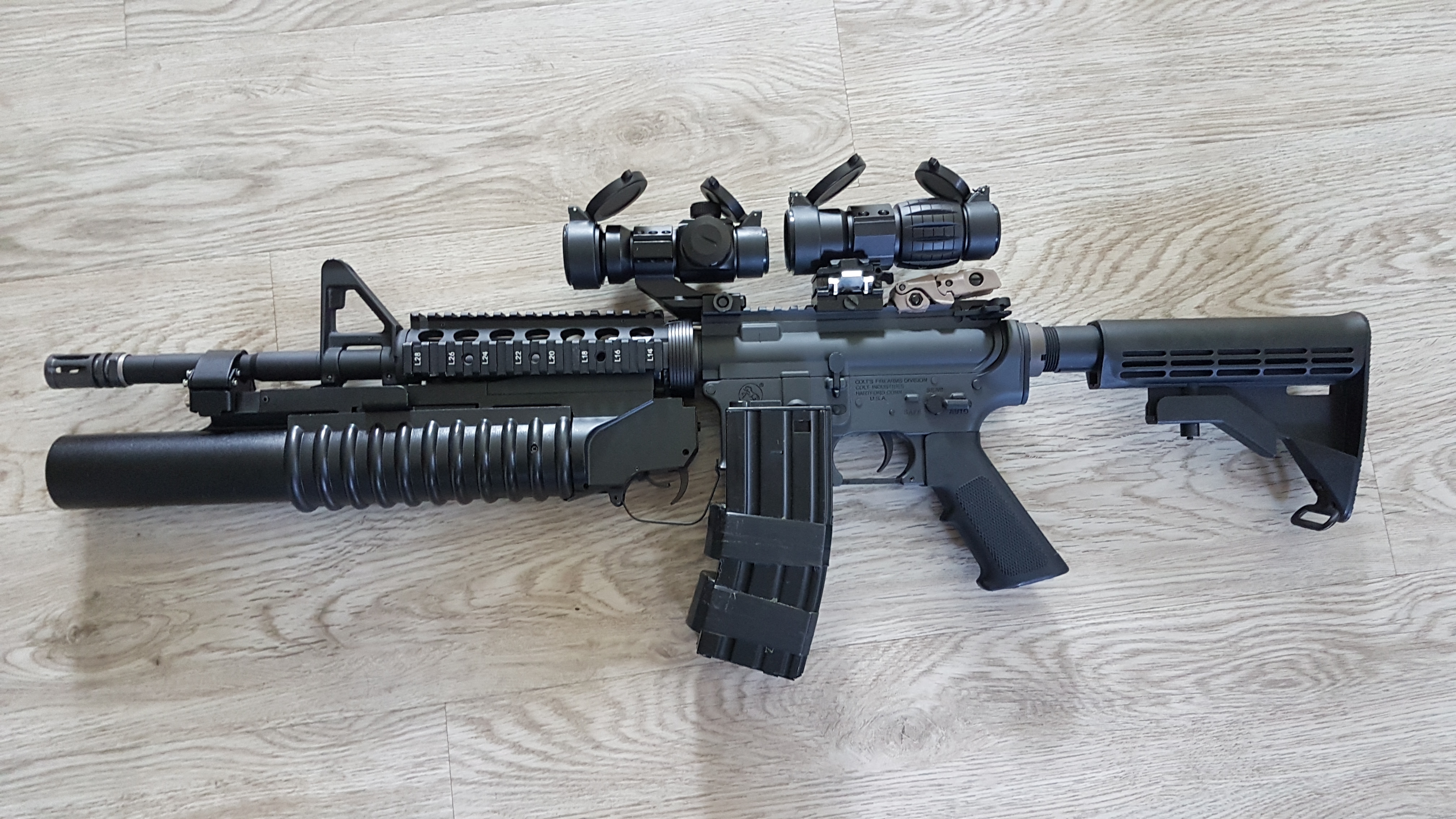 K tomu je granátomet M203 long type od firmy D-Boy pro plynové granáty, včetně granátu od firmy Classic Army na asi 160bb. Ke zbrani je dále úplně nová sklopná optika s kolimátorem (red/green dot) a sklopná mířidla. Dále zbytek kuliček, 3-bodový popruh a li-pol baterie včetně ochranného obalu. Zbraň je po upgradu pružiny 130 a přesnější hlaveň 6.04mm. Přidám ještě nenamontovaný upgrade hop-up komory a nějaké díly a mazání. To vše za 9000Kč.