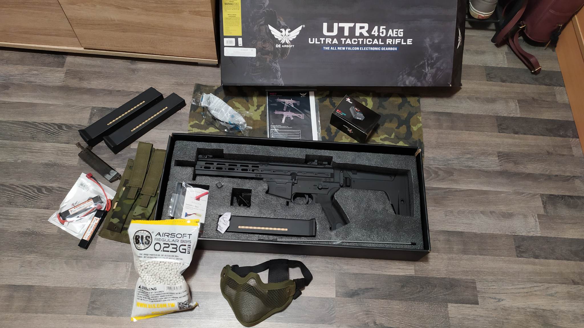 Set: Zbraň: M917G UTR 45 Nabíječka: B3 + 20W pro akumulátory LiPo Baterky: (2x) LiPo 1100 mAh 11,1V 20C DeanT (IPower) Zásobníky: (3x) Polymerový mid-Cap zásobník 120BB pro M917 UTR45 Dvojitá sumka na zásobníky (1x) Ochranné brýle čiré Ever-Lite nemlživé (1x) Ocelová maska v.1 - Olive Kuličky: Precision BB kuličky 0,23g 4300ks - 1 KG Šátek na krk vz.97 Kukla - olivová Klobouk vz. 97