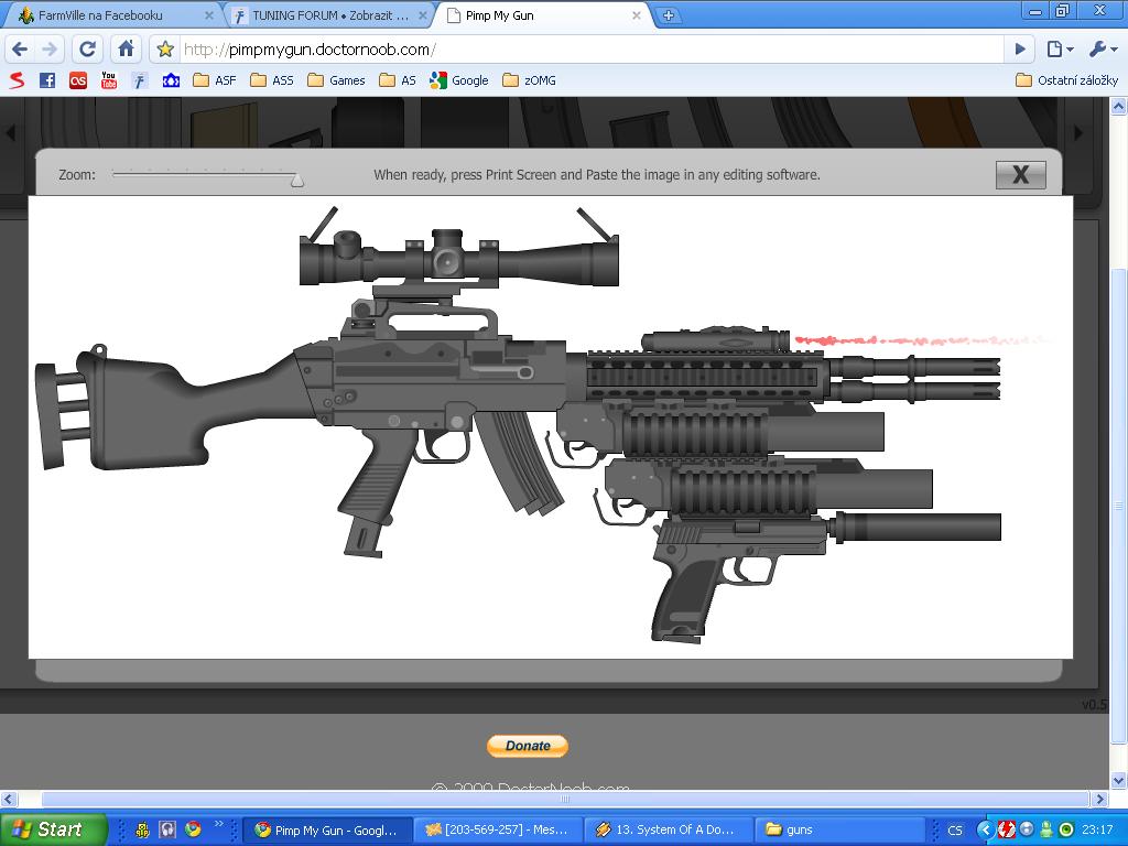 zdravim  snad je to ve správný kateghorii, zkuste tenhle web a udělejte si zbraň podle gusta http://pimpmygun.doctornoob.com/app.htmltady je jeden výsledek