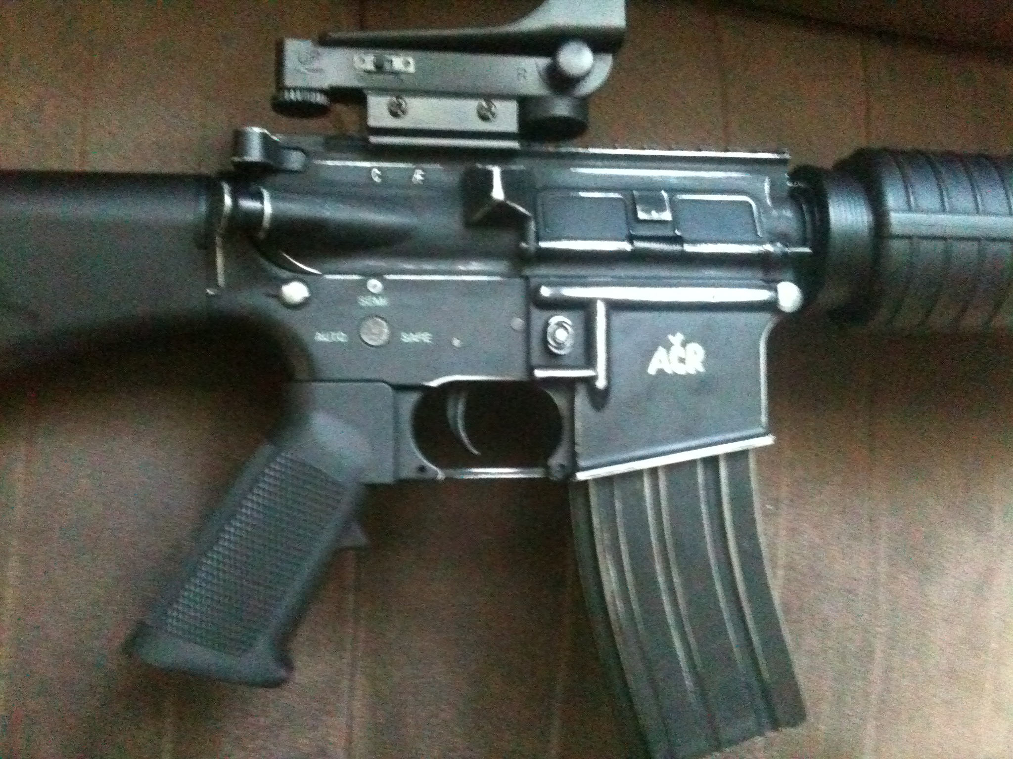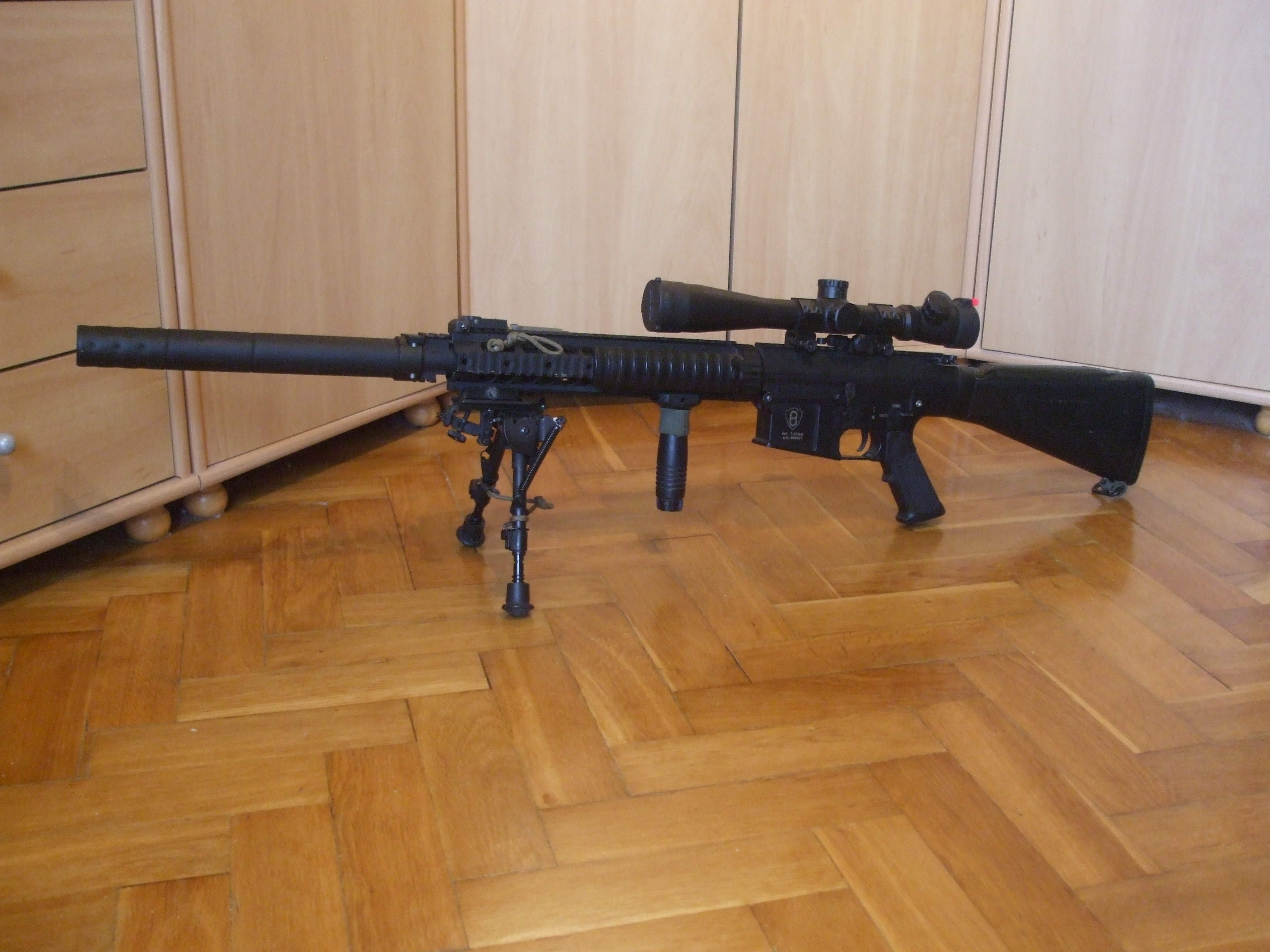 Tady posílám své DMR. Původně to je Armalite M15A4 SPR od CA. Výkon je cca 140 m/s s 0,36g BB. Tlumičem prochází hlaveň PDI 650mm/6,01mm. Mód střelby mám nastavený semi=jeden výstřel, auto=3 ranný burst. Budu měnit předpažbí za rifle Magpull MOE a doufat že tam dám Lipolku  rád bych se totiž zbavil AN/PEQ 2 a taky tam chci jinou montáž na bipod.