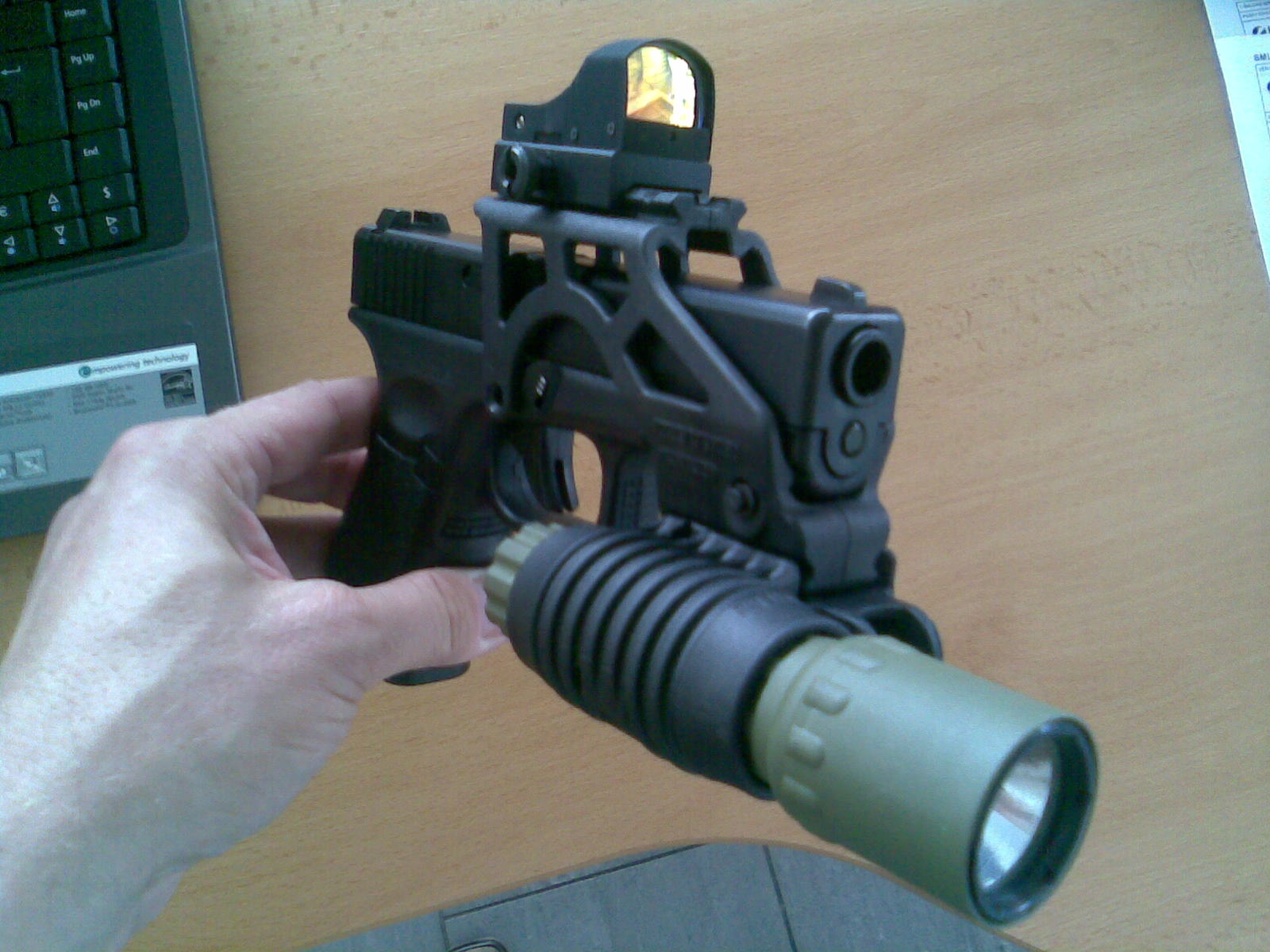 PÁNOVÉ ČUČTE !!! To co vidíte je můj plynový Glock asi 19 od KJW a doplňky z ostrého Glocka mého kolegy. Vše kupodivu přesně pasovalo. Kdyby to nestálo takový ranec, tak by to bylo dobré na CQB Co tomu říkáte???