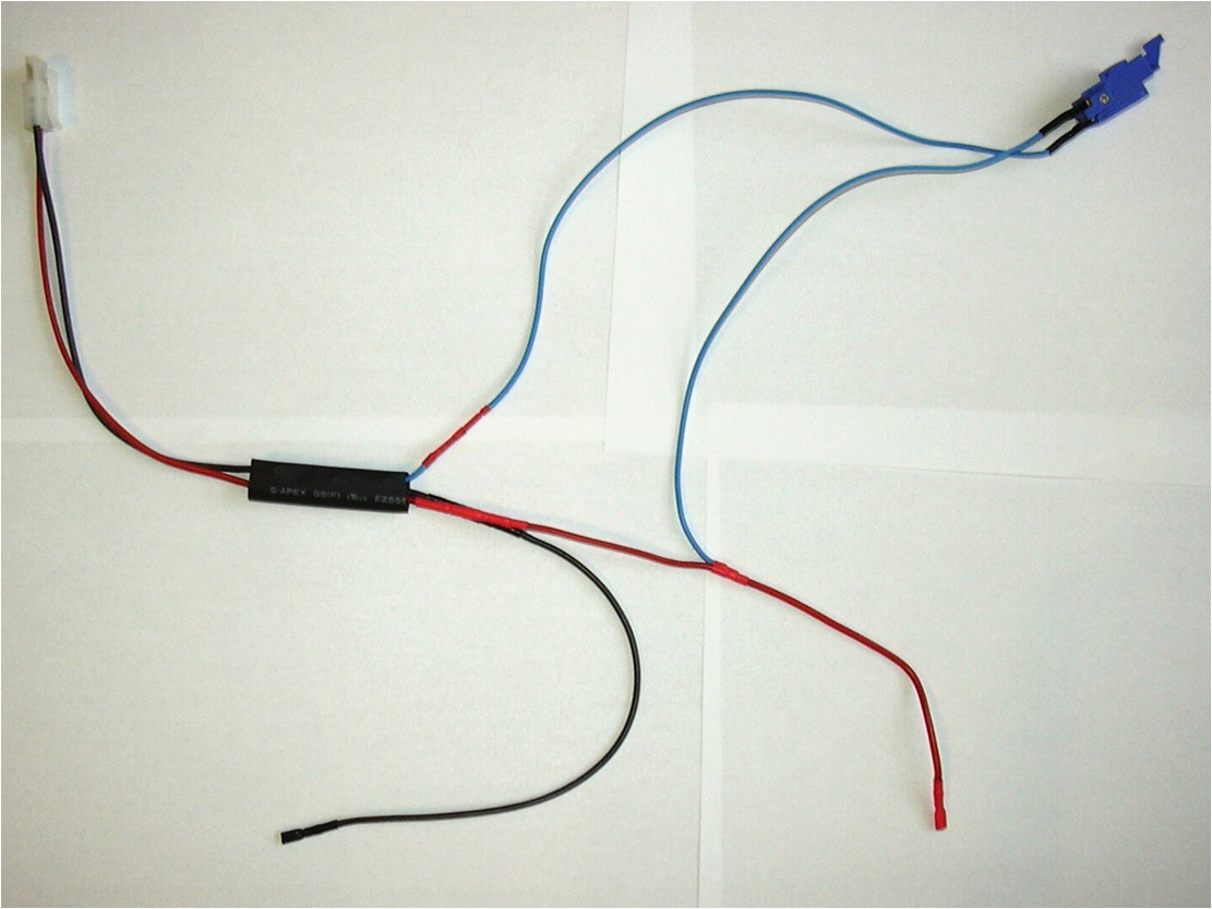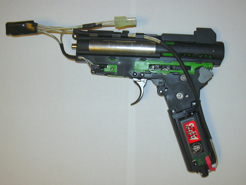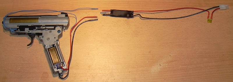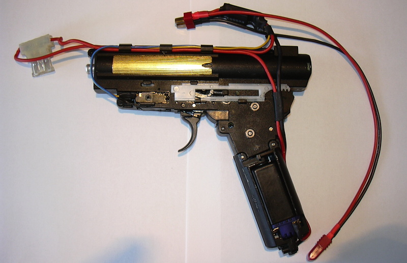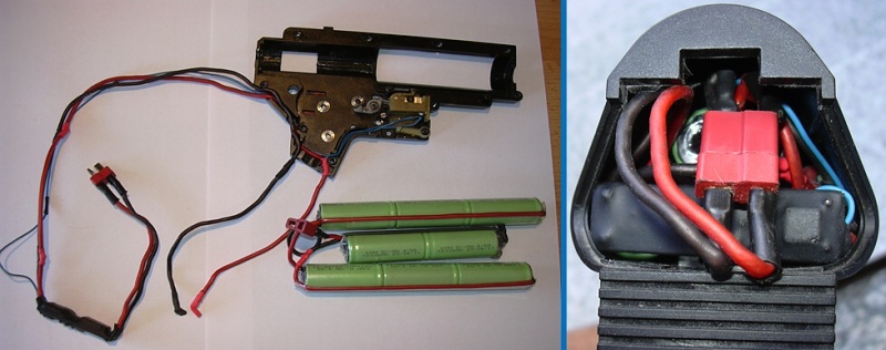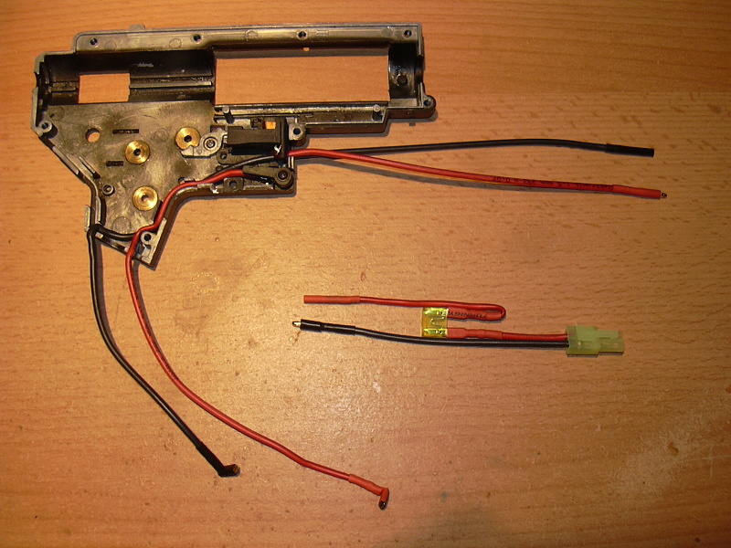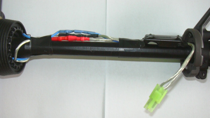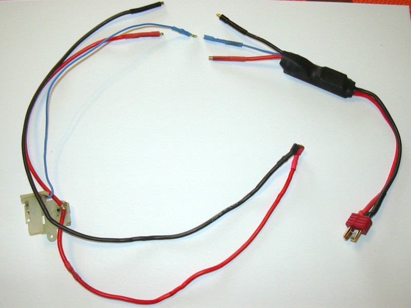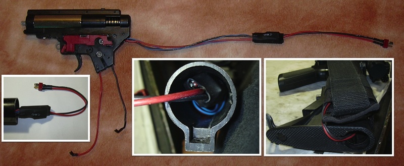 Na fotce je na zakázku vyrobená kabeláž pro zbraň M4a1 s baterií uvnitř předpažbí. Spoušťové kontakty byly použity původní ze zbraně.