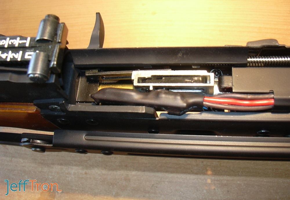 Na fotce je na zakázku vyrobená kabeláž s mosfetem (umístění v zadní části nad mechaboxem) s pojistkou vedle hop-up komory pro zbraň AKS74 s baterií nad mechabox nebo na kovovou sklopnou pažbu, kabeláž byla montována přímo na mechabox, který zázazník poslal.