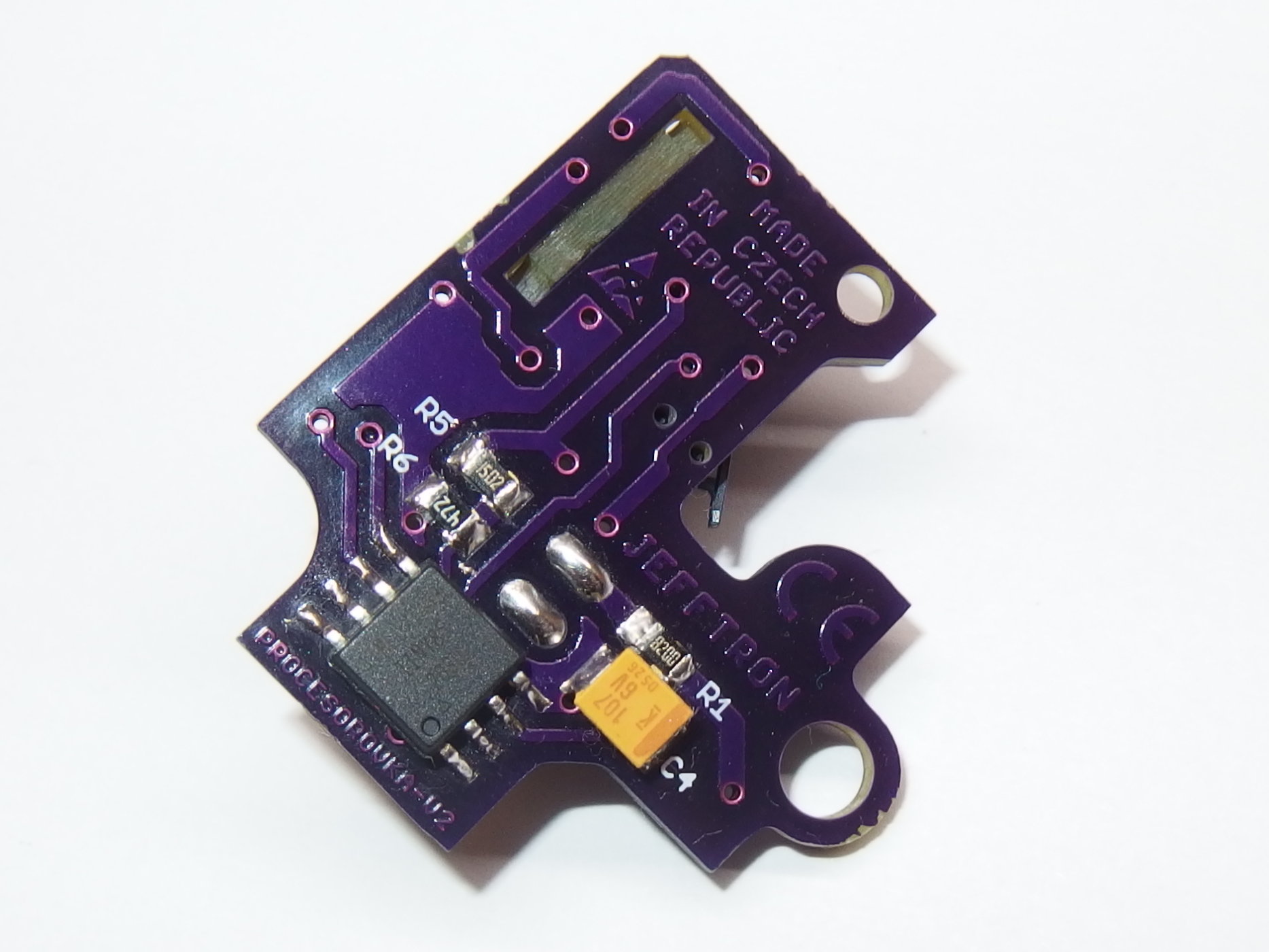 - Jak je na tom s odolností proti kapalinám: Ja bych to tak cerne nevidel, co jsem servisoval zbrane, tak spinace jsou suchy. Nicmene pri testech nikdo nehlasil problem, ani ja po pulroce odladovani programu s procesorovkou v mechu nezaznamenal problem. Kazdopadne planuji, ze verze s univerzalni kabelazi bude mit na sobe ochranny lak (stejny jako vsechny jefftron zarizeni s univerzalni kabelazi), ktery soucastky spolehlive ochranni proti vnejsim vlivum (mikrospinace nelze lakovat). Nelze lakovat ani samostatne zarizeni, protoze je pak pajeni vodicu na lakovanou desku obtizne.