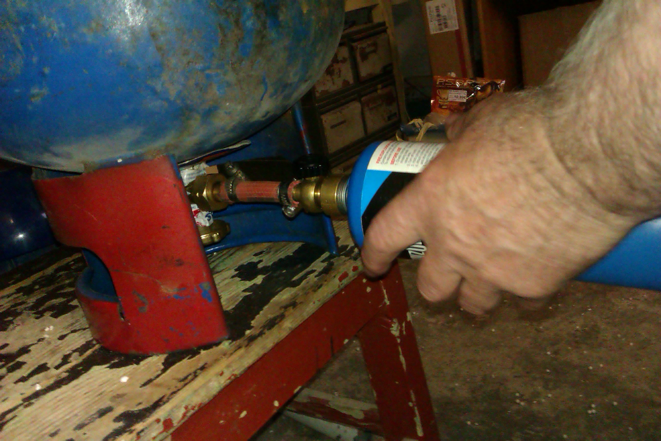 Vo fľaši už je náplň propánu z horáka si vyrobíme plniaci ventil pozor je nutné odstrániť spätný ventil (ktorý je umiestnený vo válci so šesťhranom) dierku na konci válca cez ktorú prúdi plyn nezväčšovať inak nezatlačí spätný ventil vo fľaši