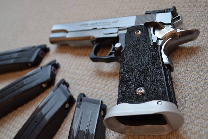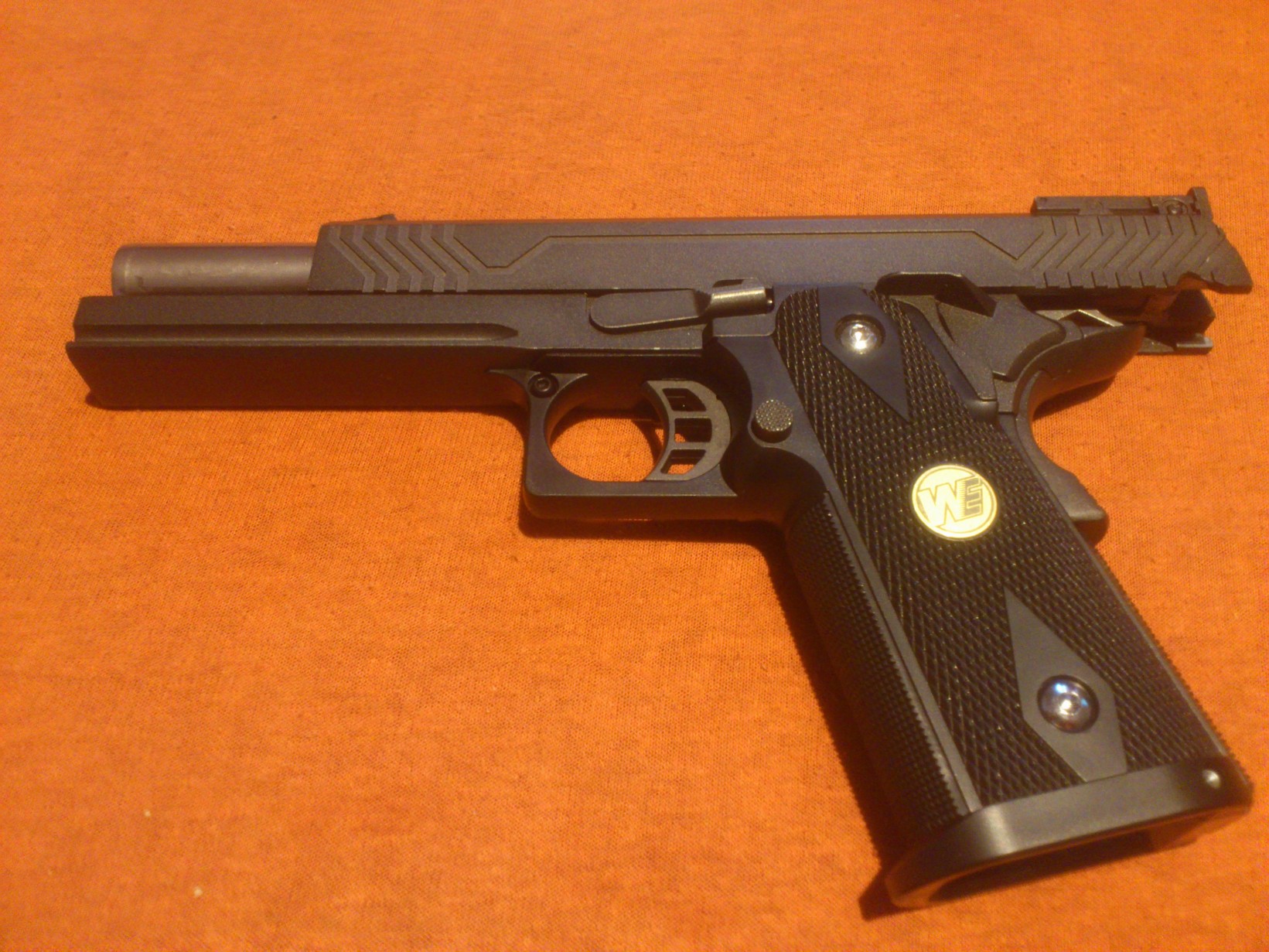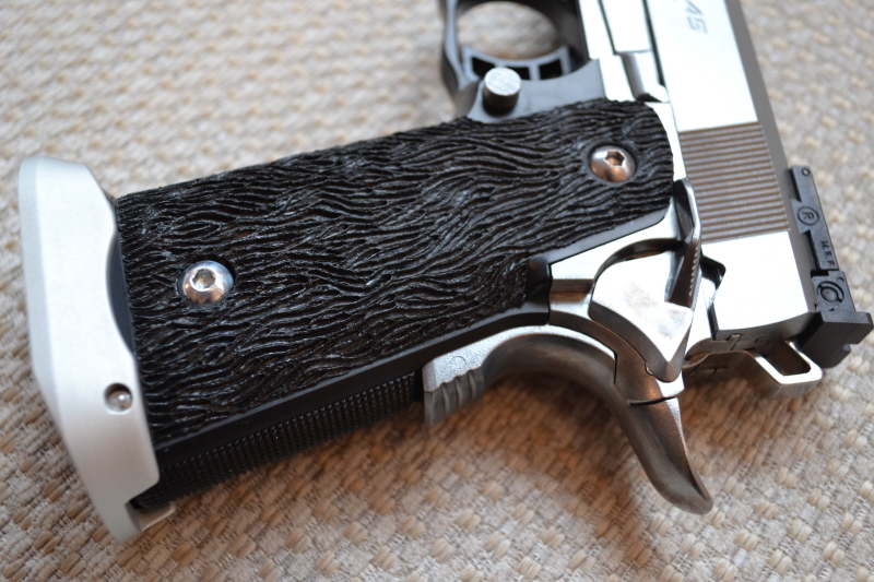 Hi-Capa 5.1 chrom Originální povrchovka kovových částí nic nevydrží, v současnosti jsou všechny kovové díly začištěny od otřepů, okartáčovány a vyleštěny dremlíkem. Klasické úpravy gripu v oblasti lučíku, původní povrch opájkován, doplněny šroubky a magwell. Co se týká ostatních úprav, tak prozatím skromně, upraveny originální ventily v zásobnících, zásobníky dostaly fialové gas route nineball. Světlovodná muška, odlehčený plug a 150% bicí pružina, momentálně je instalována originální vratná pružina, se silnější a plynem 144a nefungovalo stoprocentně nabíjení. Zip