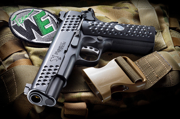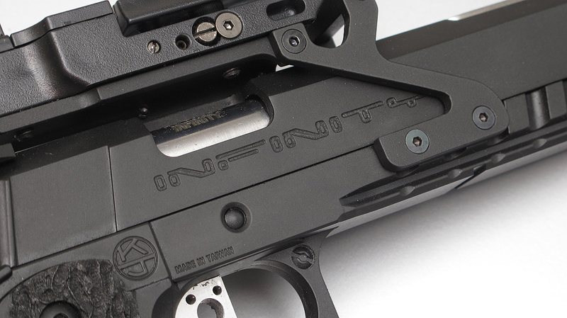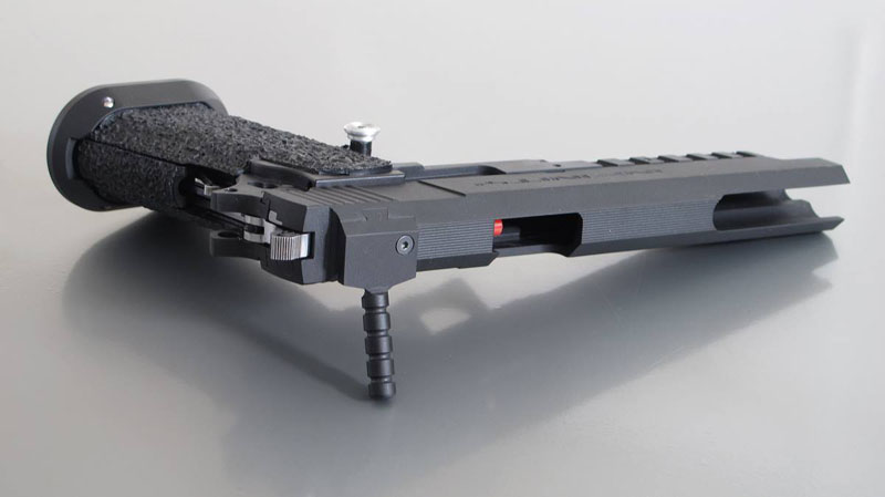 TM Hi-capa 5.1 - Limcat custom Gunsmith - Mike Cripps - EnglandZáver - ProHandgun Limcat Wildcat custom 6" + kompenzátor + oceľová vonkajšia hlaveň Rám - Tokyo Marui Hi-capa 5.1 čierna so striebornými ovládacími prvkami Elite Custom - 6" nerezová vnútorná hlaveň 6.02 mm ProHandgun duralová nastaviteľná spúšť - odpor 0,9 kg ProHandgun oceľové kladivo STI style magwell AIP loading nozzle NineBall HopUp AIP Blowback light unit Guarder springs 150% C-more replika AIP carbon montáž na optiku Elite Custom grip duralová naťahovacia páka hammer plate (ochrana záveru pred odtlačením od kladiva) duralový thumb rest AIP magazine bases - duralové - strieborné Skrátený chod záveru - short stroke buffer